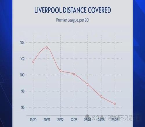 当然这里要强调,这不是斯洛特到来以后才有的趋势。统计数据表明,自2021-22赛季至今的最近5个赛季,利物浦在跑动距离方面呈现连年下降趋势,包括渣叔的最后3个赛季。