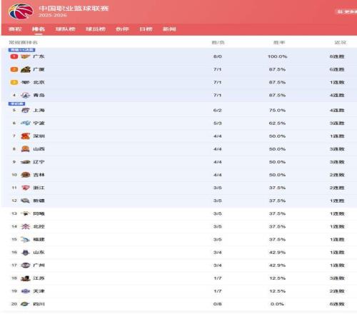 12月30日,随着CBA常规赛第8轮全部战罢,各队之间的竞争愈发激烈,积分榜的排名也渐趋明朗。广东男篮客场轻松大胜天津队,8连胜高居第一,成为全联盟唯一一支未尝败绩的球队,可谓独孤求败。黑马青岛男篮居然高居第4位,和广厦北京并驾齐驱。四冠王辽宁男篮就有点惨了,排名直接掉出了前8名。山东男篮大胜山西队之后,排名也是连升3位。