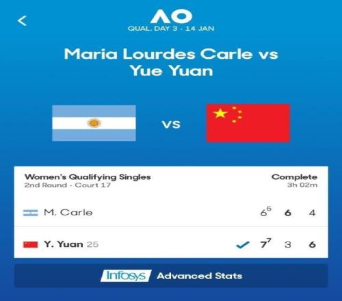 袁悦鏖战3小时以2比1战胜卡莱,晋级澳网女单资格赛决胜轮