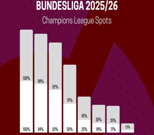 数据机构预测德甲前4名概率:拜仁100%,多特94%,勒沃库森83%